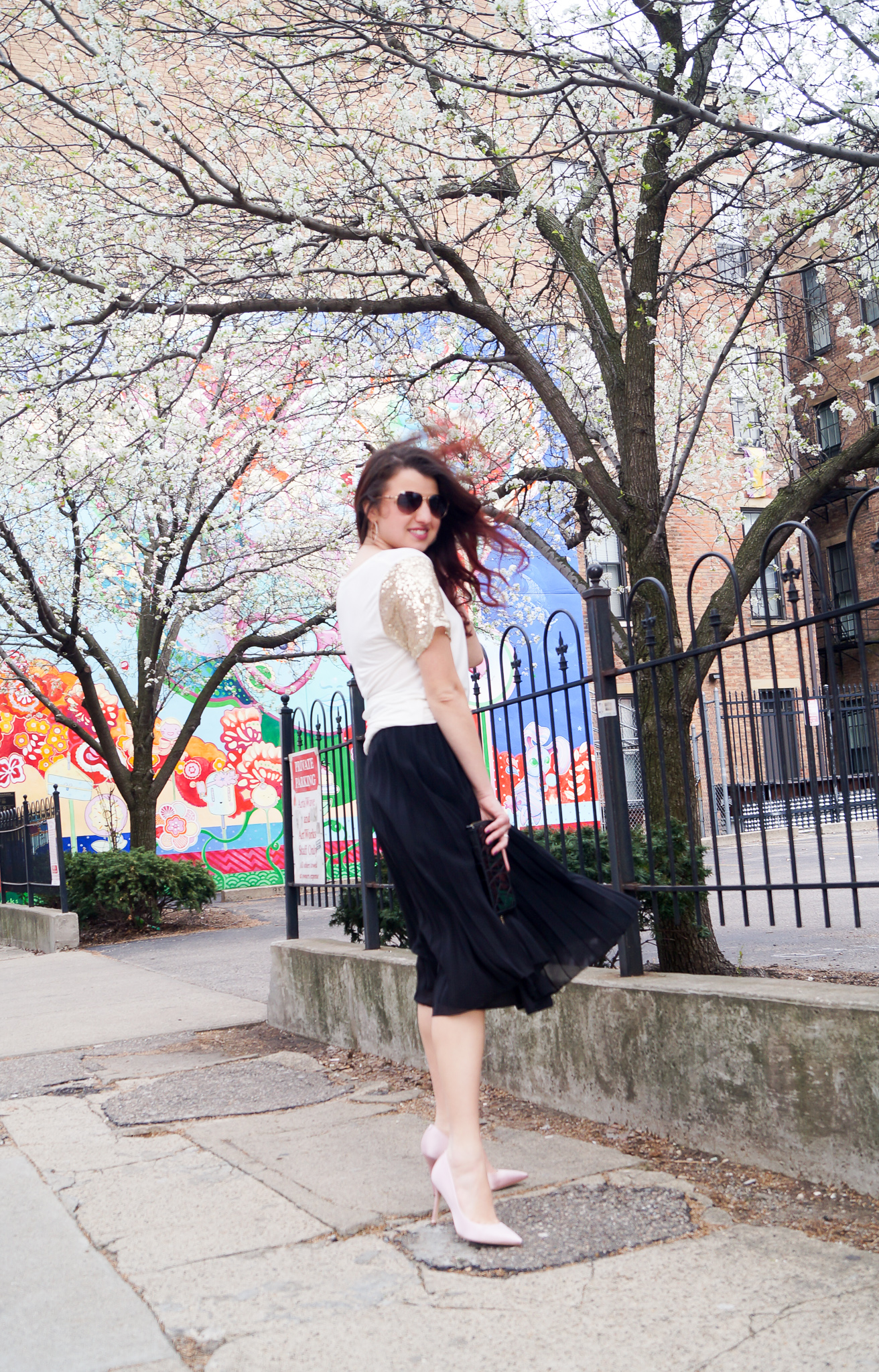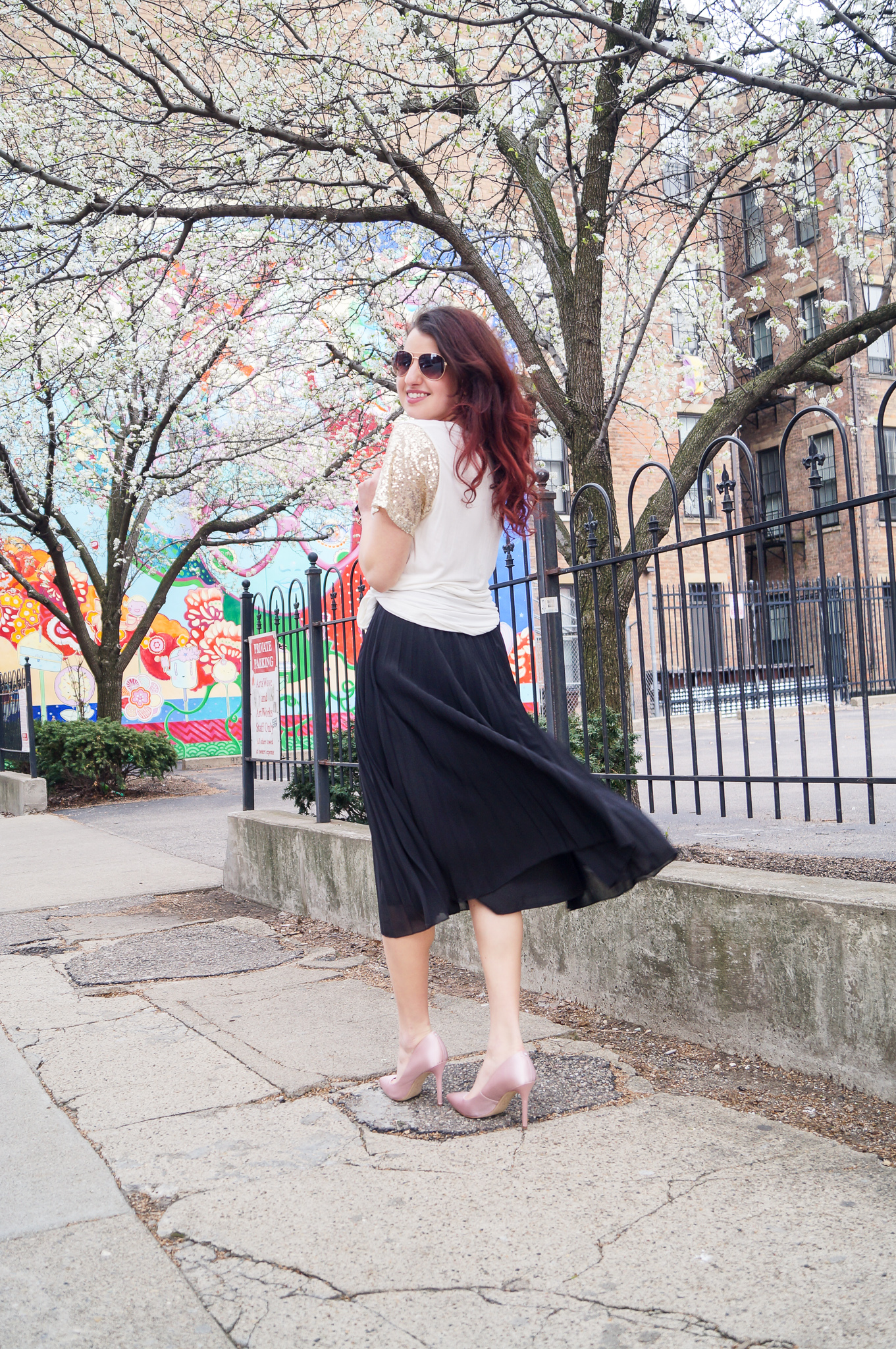Last night’s outfit consisted of three things: my favorite black pleated midi skirt from ASOS, a sequin sleeve top from Vici and pink satin Hazel pumps by Sam Edelman. I kept the accessories to a minimum because of the statement sleeves and the pop of pink with the shoes.