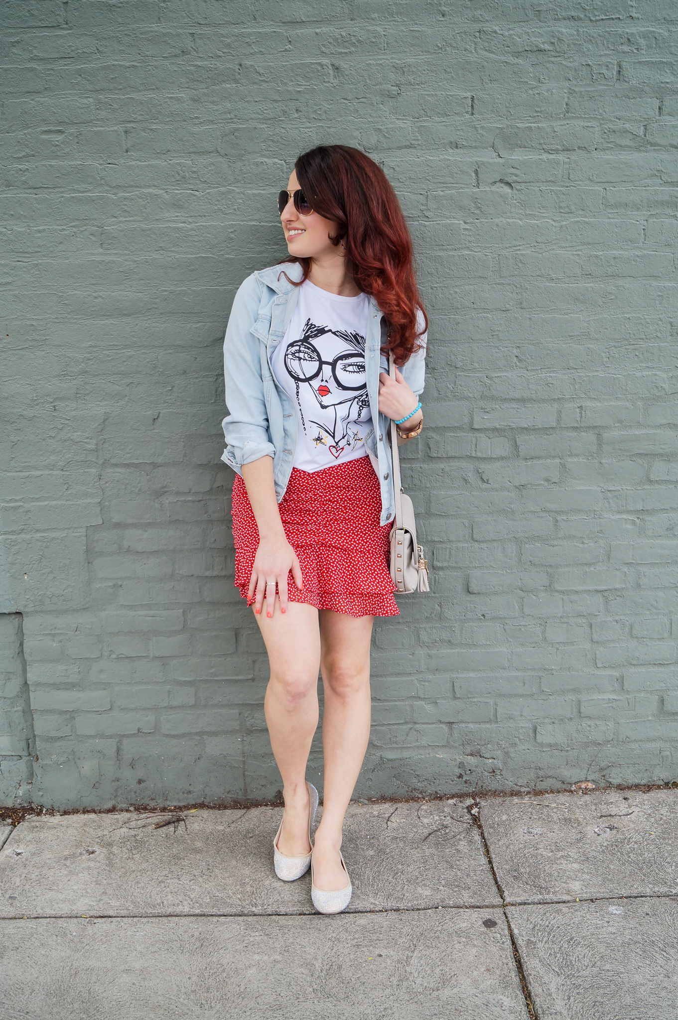 This is probably my favorite way to wear a graphic tee because it is a good way to make a casual top look, well, not so casual. I think white and black graphic tees work best for this look and I think colorful, flowy skirts are also the way to go. I paired the top up from this red skirt from Not UR Ordinary Fashion and threw on a light denim jacket. I finished the look off with some sparkly flats and a nude purse and voila – I am ready to go out on a daytime date or any daytime activity.