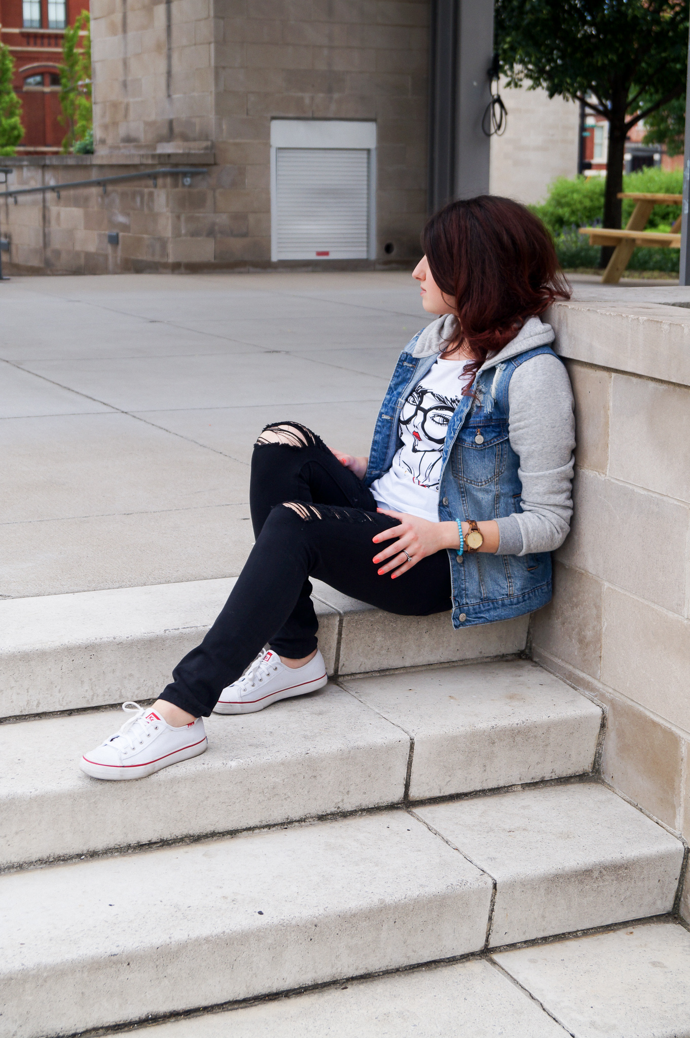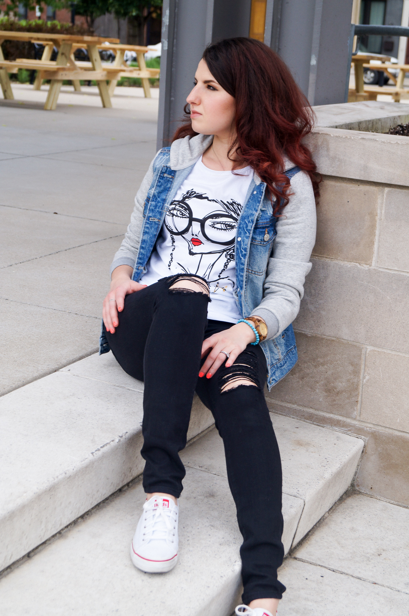 Now to the comfy version of this look. I mention comfy because what’s more comfortable than jeans and a pair of Keds? In this look, I paired the top up with a pair of distressed black skinny jeans and my denim hooded jacket (that you’ve probably seen on my Instagram a million times already). This look is great for just casual days and if I could reverse the look and wear white distressed denim with a black graphic tee, I would.