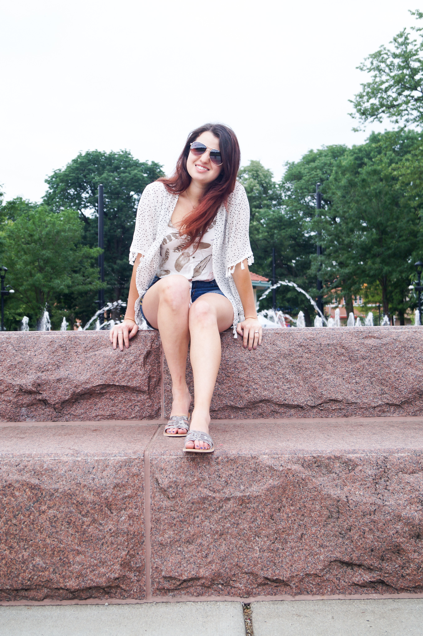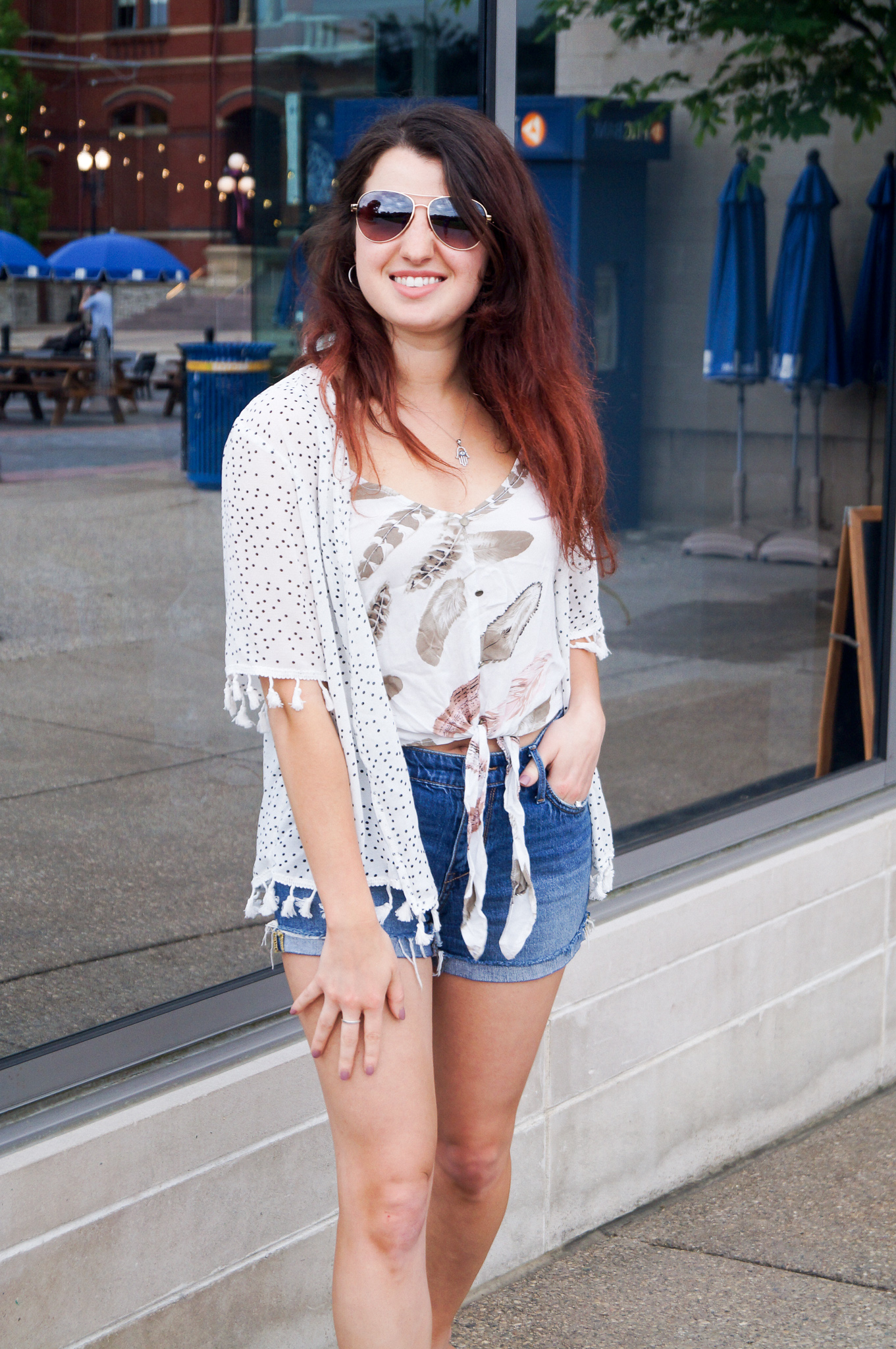 I grabbed this sheer polka dot, tasseled kimono and threw it on top another pattern (anyone else loooooveee when you can get some good pattern mixing going?) and finished the look off with my favorite high waisted Sam Edelman shorts. This look allows you to run summer errands, hang out at the park in the heat without getting too hot, and can most definitely be also used at the beach as a bikini cover up. Find that piece here on the website.