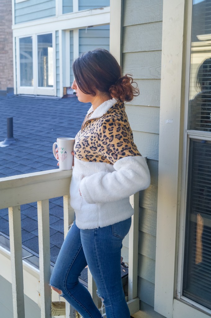 This leopard half zip sweatshirt. This is what your cozy winter dreams are made of. This is the softest, comfiest item of clothing I’ve ever worn and usually, only the taste of coffee can make me this happy. The picture you see below is from the equation of coffee + cozy sweatshirt = happy Yuliya.