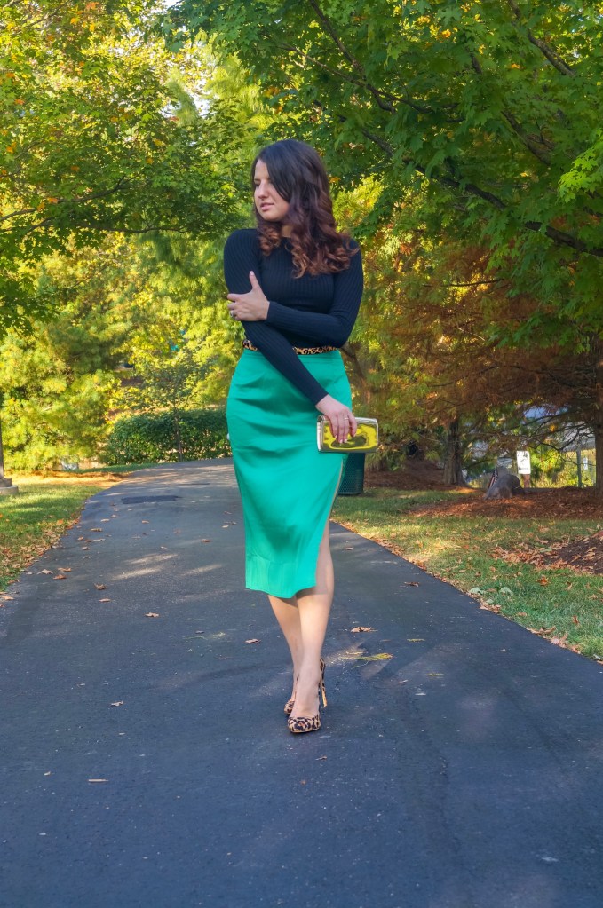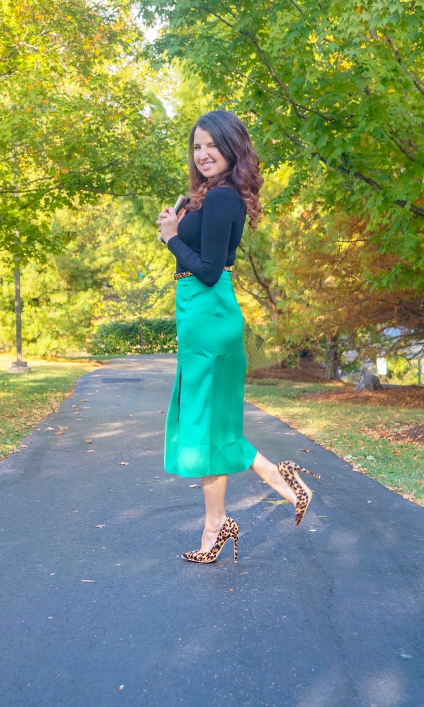 One of my main color combinations for fall is definitely green + leopard. The second I got my hands on this beautiful silk skirt from SheIn, I knew I had to add a leopard belt to it. That is how this outfit came to be.